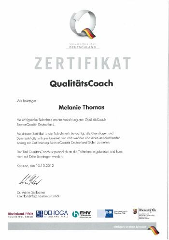 Unsere engagierte Mitarbeiterin, Melanie Thomas, hat die Ausbildung zum QualitätsCoach bestanden. Damit ist unser Betrieb nun in der Lage den zweiten Schritt anzugehen und ein hochwertiges Qualitätsmanagement für unser Kunden einzuführen. Im Anschluss können wir dann das QualitätsSiegel "ServiceQualität Deutschland" für einen Zeitraum von drei Jahren erwerben. Damit nutzen wir die Möglichkeit unsere Servicequalität auch nach außen zu dokumentieren.