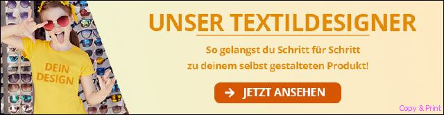 Kennen Sie schon unseren neuen Textildesigner! Einfach anklicken, anschauen und ausprobieren. Erstellen Sie mit unserem Textildesigner Ihre individuell gestalteten Textilien. In unseren Videos können Sie genau sehen, wie Sie Ihr eigenes Design erstellen und Ihr Wunschprodukt bei uns bestellen können. |